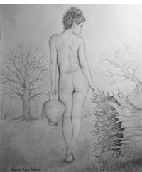 In the expressive strokes of graphite on paper emerges "The Fallen," a compelling narrative captured within the delicate portrayal of a woman navigating a landscape of fallen trees. Cradling a ceramic water jug, her gaze fixates on the intricate roots of a specific fallen giant amid a backdrop of leafless trees stretching into the distance.